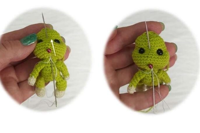 - Round 10: Attaching the front paws! 2 sc, then work 3 sc together with the right paw, 4 sc, then 3 sc together with the left paw, 2 sc. (14) Important! The paws must be positioned exactly on the sides!