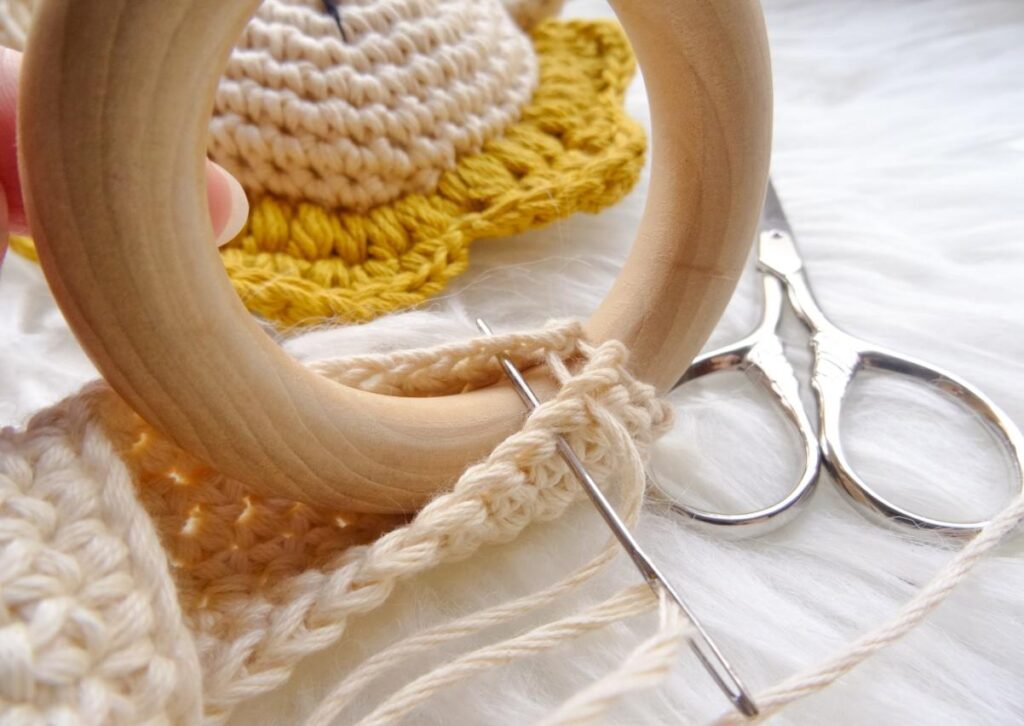 What I love most about this pattern is how it combines different elements into one beautiful toy. The head is worked in the round with a special bobble stitch (punto garbanzo) that creates that wonderful fluffy mane texture. The face is embroidered with sweet closed eyes that give Bali a peaceful, sleepy expression—perfect for a baby’s nap time companion. And the whole thing attaches to a natural wooden ring that’s easy for little fingers to hold and shake.