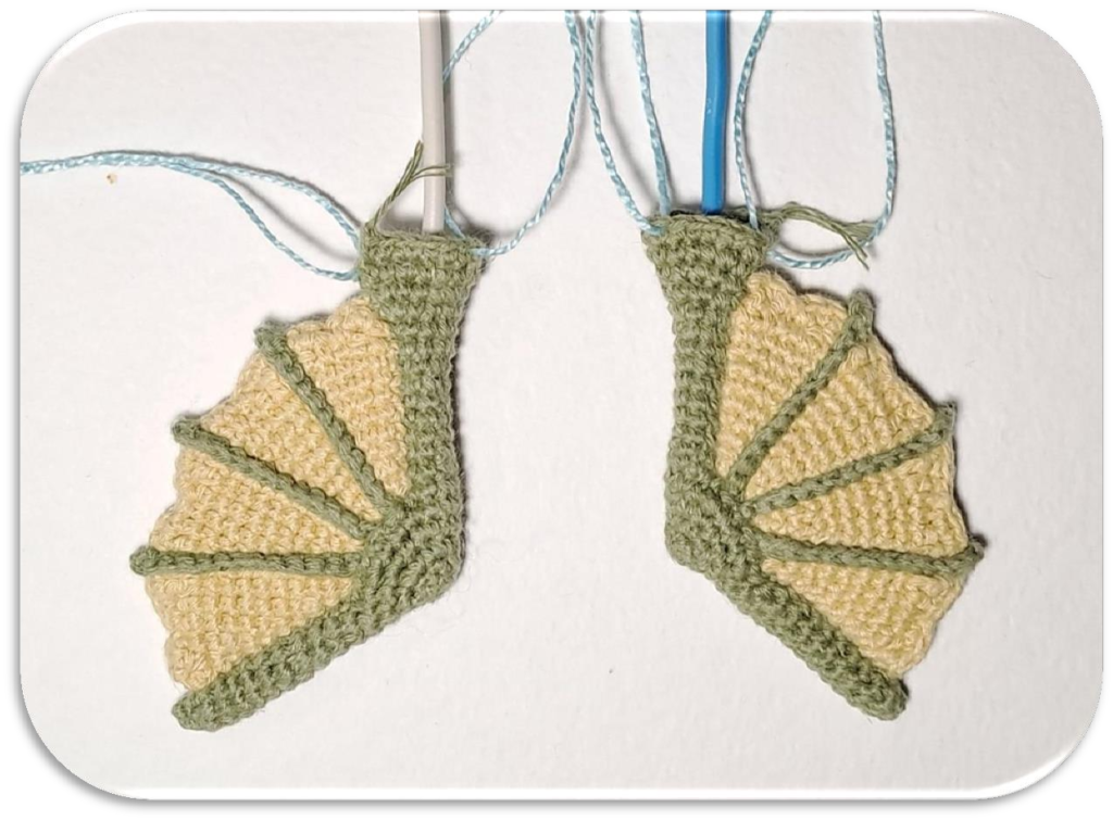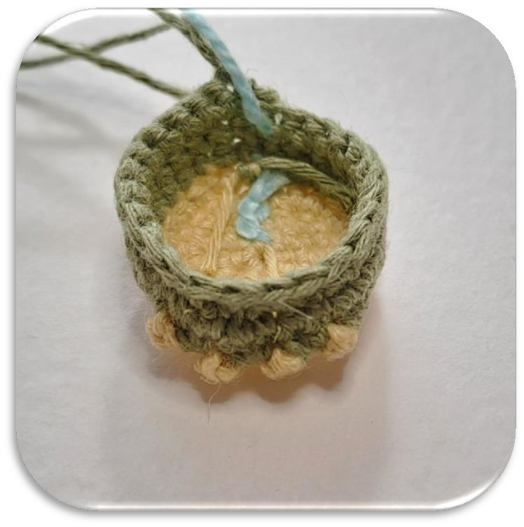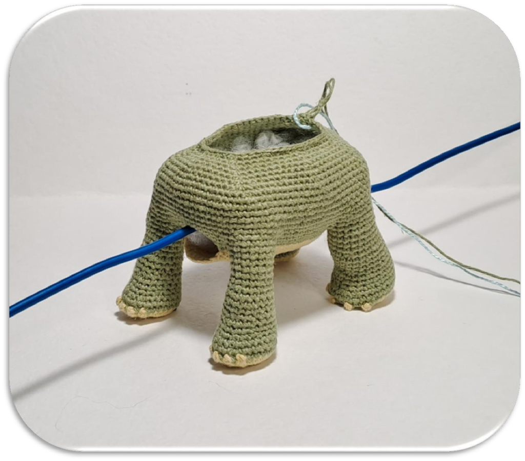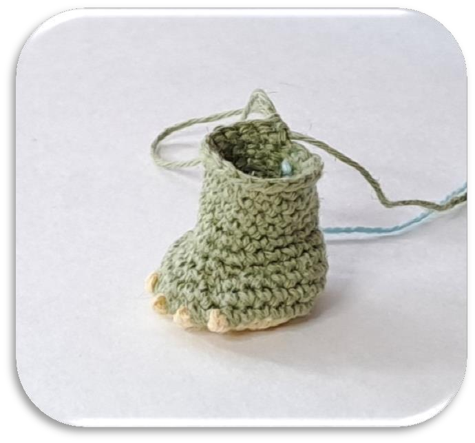 • Rnd 5: 1 sc, inc, 5 sc, inc, 1 sc… (Follow the pattern carefully to shape the little dragon feet!)